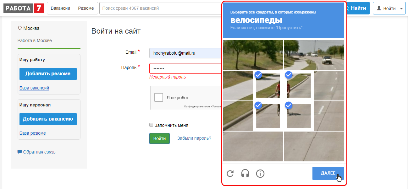 Если при входе в работодательский кабинет на Rabota7.ru появилось окошко с надписью «Я не робот», значит, система заподозрила вероятность взлома вашего аккаунта. Чтобы удостовериться, что это именно вы, а не компьютерные программы, внедренные спамерами или мошенниками, система предлагает задачу, которая крайне трудоемка для компьютера.
